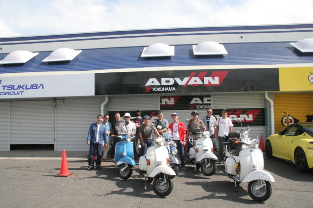 | パドック内のADVAN前にスクーターを駐車させて頂きました。 ちょっと整列して記念撮影!! その後は各自でサーキット内を散策して楽しみましたぁ〜〜〜〜〜〜〜〜。 |